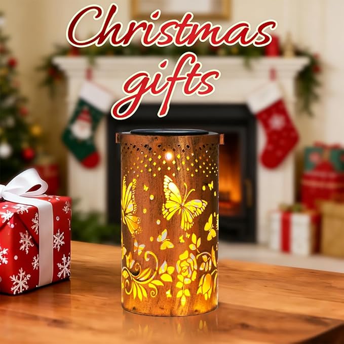 Gorgeous & imaginative Garden Decor - Fusion the retro gold, copper of exteriors and irregular pattern inside, at darkness, the solar lantern casting a bright, warm light with Butterfly pattern, which looks like a Butterfly flying symbolizes change.