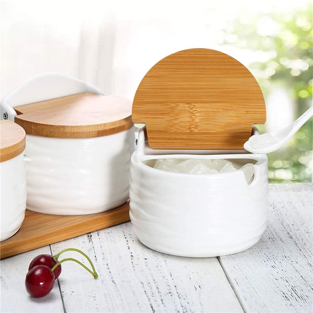 FLIP TOP SUGAR SALT BOWL - Handy and space-saving. Combination for multi use ceramic jars to store salt, sugar and pepper at a set. A strong helper to make kitchen organize neatly and work effectively.