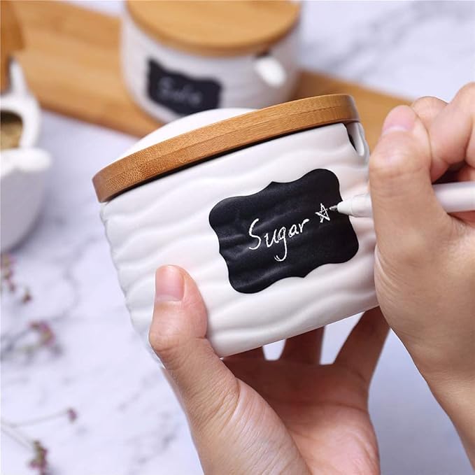 SET OF 3 CERAMIC SPICE CONTAINER - Porcelain condiment jars come with wood tray, are finished with a shiny glaze look, very cute and fashion. Suitable for home, cafe, buffet, party, etc.