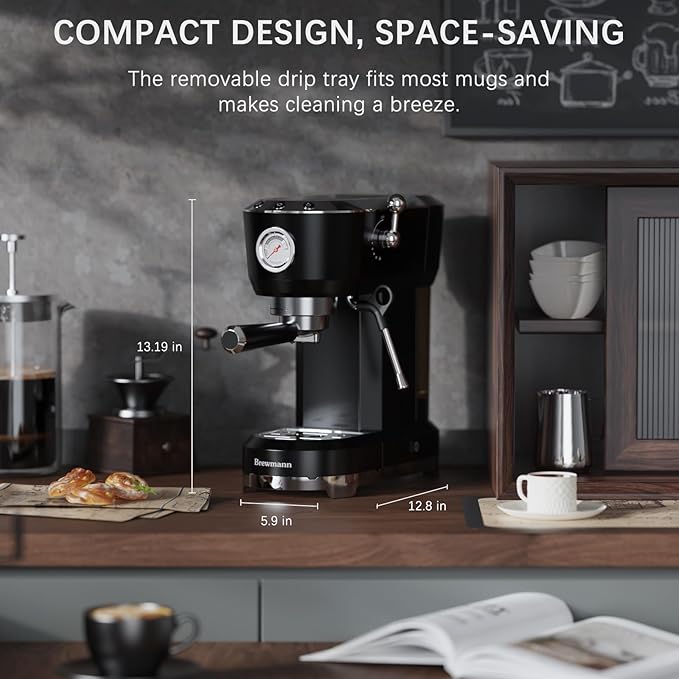 Color : Black Product Dimensions : 12.8"D x 5.91"W x 13.19"H Special Feature :Auto Shut-Off, Cup Warmer, Milk Frother, Permanent Filter, Removable Tank Coffee Maker Type : Espresso Machi