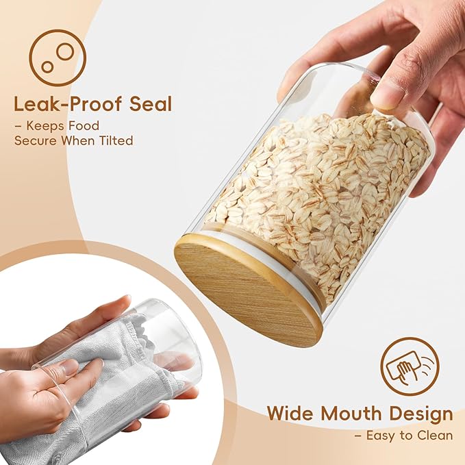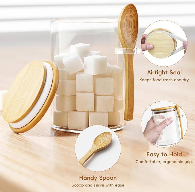【Material】 Glass transparent jar made of high-grade borosilicate glass, exquisite craftsmanship, high temperature resistance, tight texture, durable. Comes with natural bamboo lid and spoon, healthier and Environmentally friendly than plastic material